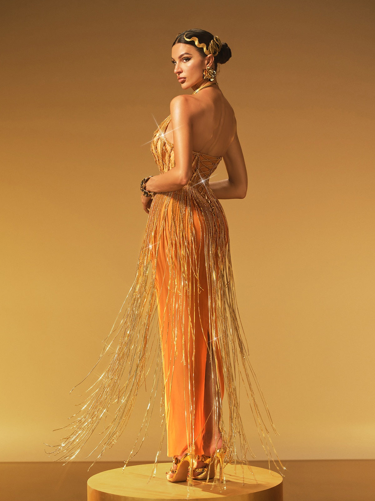 Jyrviel Straplez Zincir Püskül File Maxi Elbise